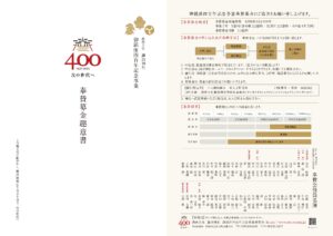 諏訪神社御鎮座四百年記念事業へのご奉賛をお願い致します 2025-12-02 最終更新日時 : 2025-12-02 staff 下記趣意書の通り記念事業を展開して参ります。皆様方からの心からのご奉賛をお願い申し上げます。 奉賛会では、諏訪神社において奉賛金の受付(現金・銀行振込)を行っております。詳細につきましては、諏訪神社(095-824-0445)までお気軽にお問い合わせください。 尚、趣意書及び申込書の郵送も承ります。 趣意書・申込書は下記PDFをダウンロード、印刷してご利用ください。 趣意書ダウンロード 御奉賛申込書ダウンロード