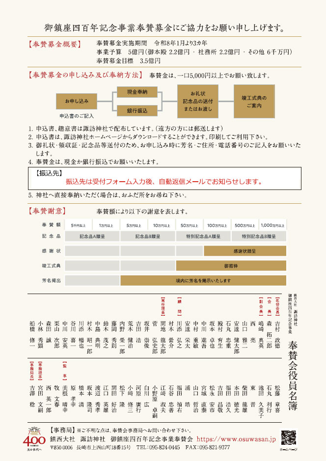 受付方法は下記「奉賛金の受付メールフォーム」より詳細を入力され「鎮西大社 諏訪神社 四百年奉賛会」口座番号より銀行振込いただけるようご準備しております。