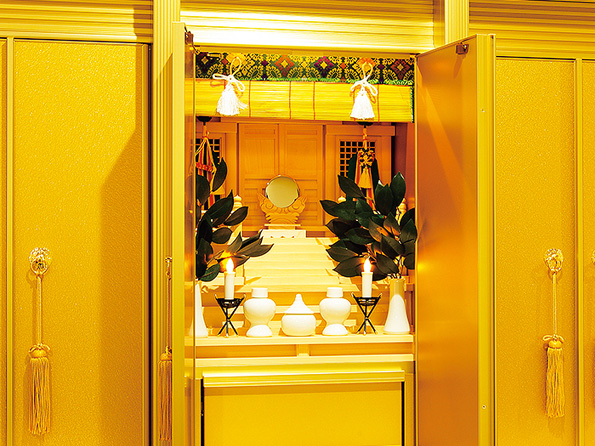 内部は安全面を考慮し、扉の開閉による自動点灯式となっており火災の心配もございません。(灯明は手動式)